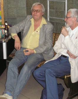Dieter schleppte auch zum Jubi-Con eine schwere Tasche mit Bier an, "der Kantineur hier ist mir zu teuer" meinte er lapidar, als ich ihn verschwitzt ankommen sah. Diese Knauserigkeit war mir neu, Dieter hatte Geld, auch wenn ihn Erbschaften (Vater starb vor einigen Jahren, sein Bruder vor zwei/drei Jahren) teilweise mehr kosteten als bereicherten. Bild unten Dieter und sein "mitgebrachtes Bier", plaudernd mit Gert ZECH.