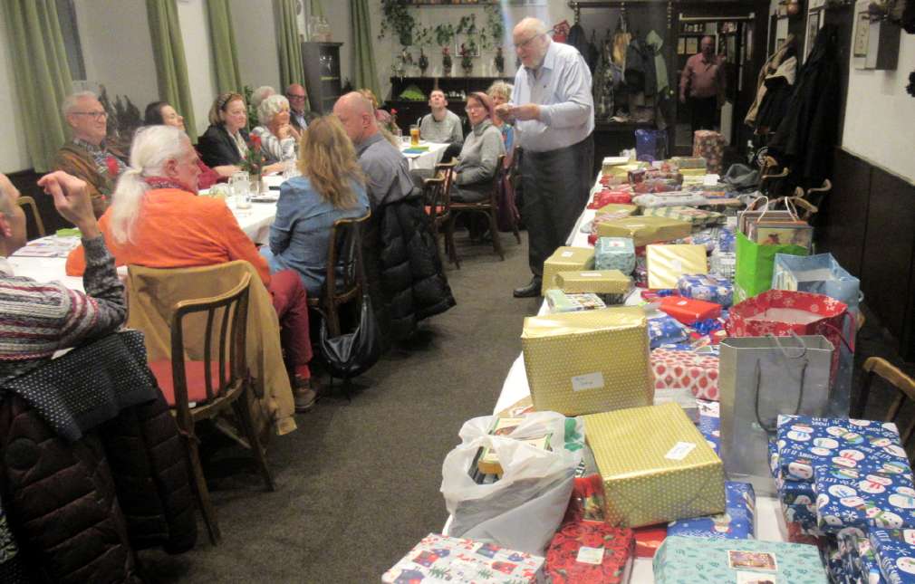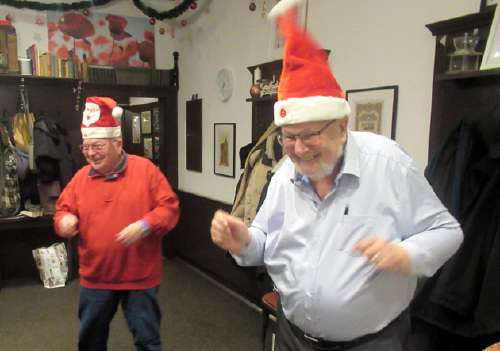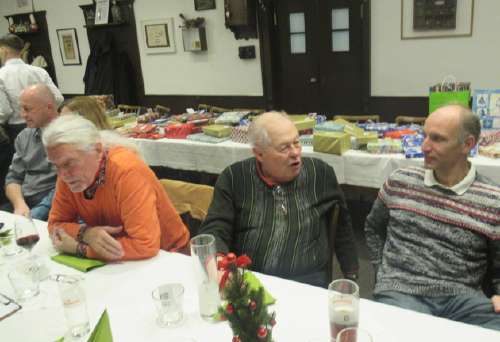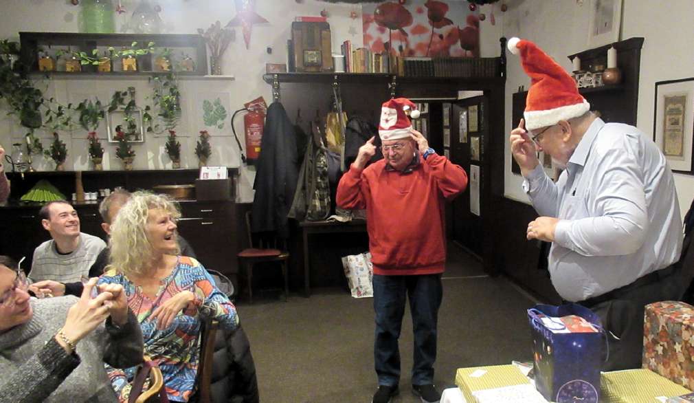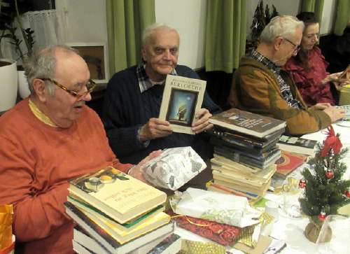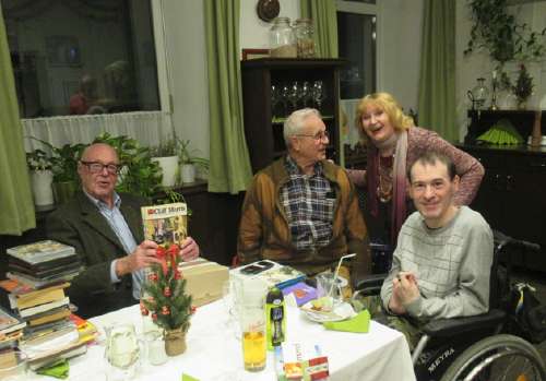 SF-Buchautor Alfred und Michaela sind bester Adventlaune Franzl und Robert vor ihren Geschenkbergen Gerhard, Edi, Hans-Peter und Comichändler