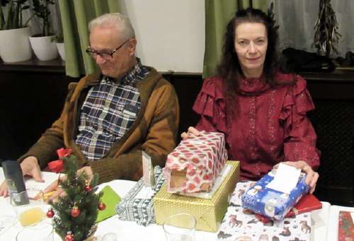 Verena Peter stöbert schon in seinen Geschenken, Helmuth
